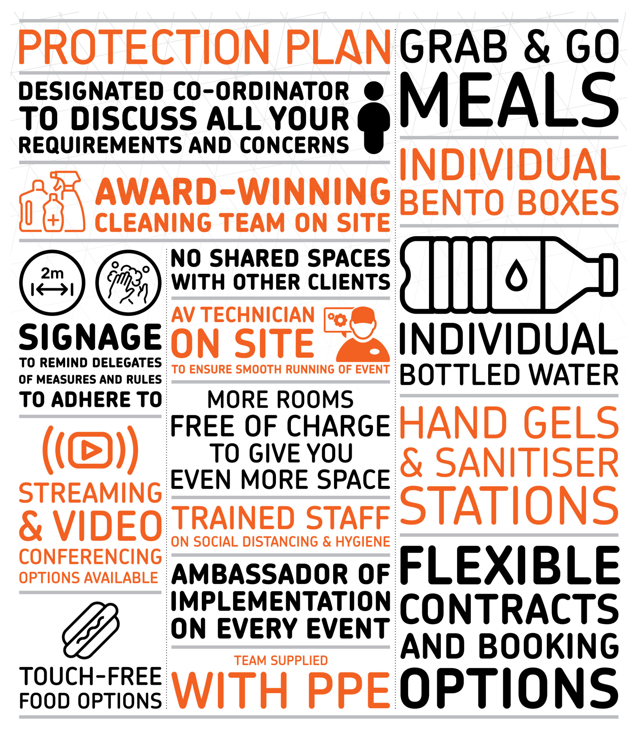 As mentioned above, Millennium Point has released our Client Protection Plan (CPP) which outlines in detail how we are adapting and implementing measures to protect you, your booking, your delegates and our staff during this unprecedented time. Measures include queue management barriers, signage and floor markings and contact-free catering. For full details please visit this webpage here or get in touch with our team on 0121 202 2200.